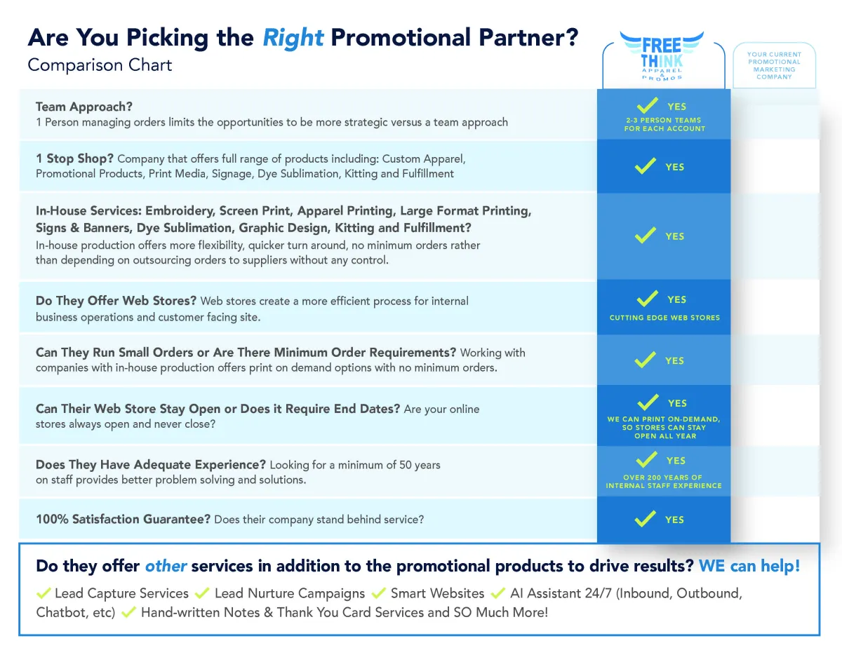 Promotional products create brand visibility, but we go beyond swag. Additional services including lead capture forms, smart website services, and AI booking turn that visibility into paying customers.